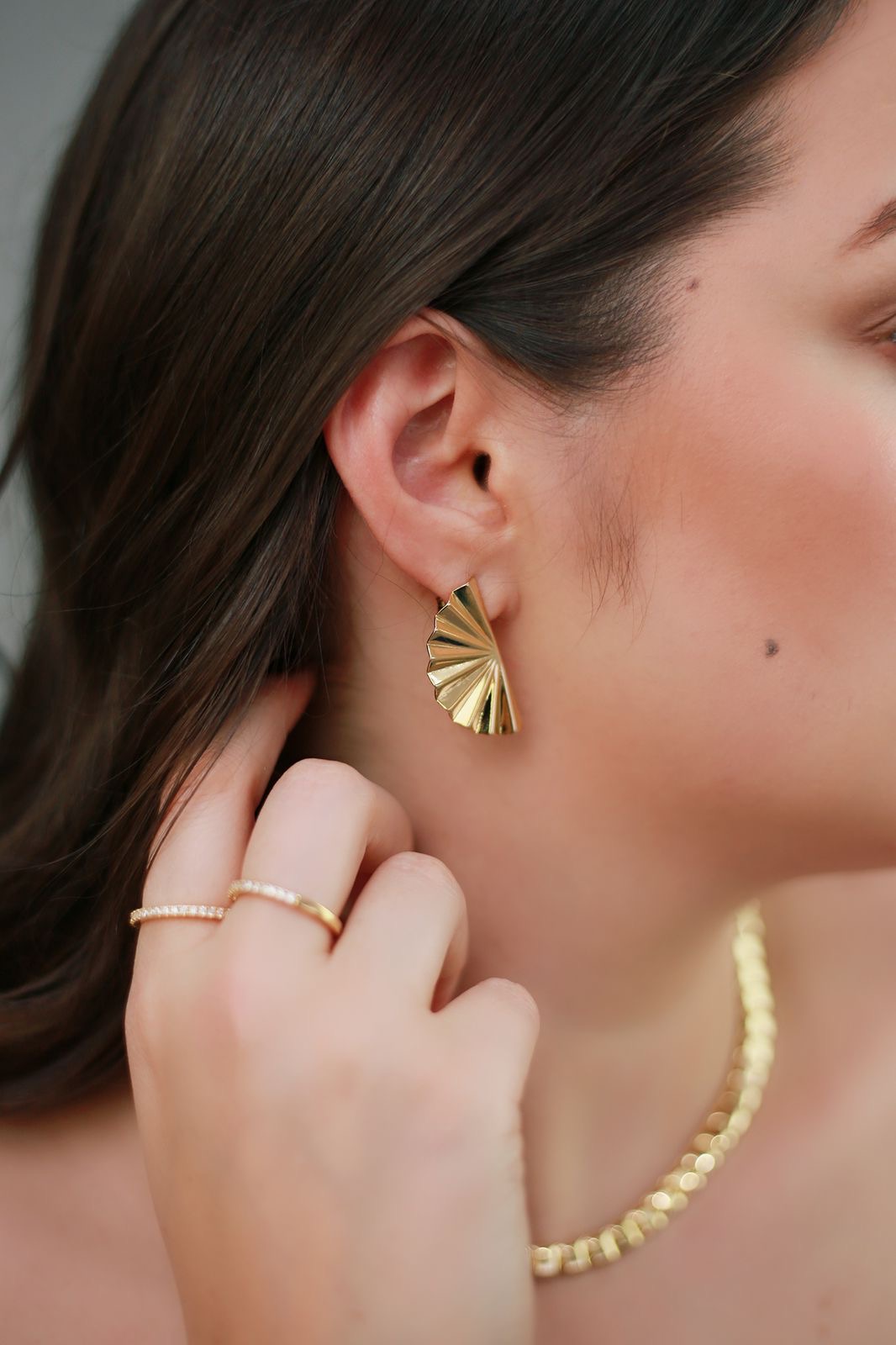 Experimente a leveza e a sofisticação com o Brinco Brisa. Inspirado na forma delicada de um leque, este brinco combina elegância e modernidade em um design encantador.